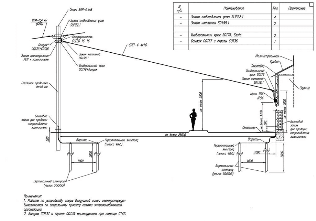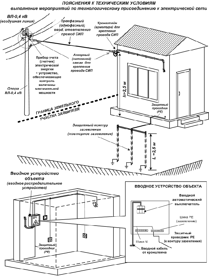 *Подключение от ВРУ к дому рассчитывается по индивидуальной смете отдельно и зависит от расстояния от опоры до постройки.