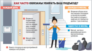 МероприятиеРазновидности оборудованияНет оборудованияУстановлен мусоропроводЛифтНаличие лифта и мусоропроводаУборка 3 нижних этажей1 раз за деньЕжедневноКаждый деньЕжедневноПодметание всего подъезда3 раза за неделю3 раза за неделюЕженедельно2 раза в неделюУборка лифтовой кабины (мытье пола)——Каждый деньКаждый деньПомывка стен и дверей лифтов——Дважды в месяцЕжемесячно (2 раза)Уборка пыли с потолкаКаждый год1 раз в годЕжегодно1 раз в годМытье полаДважды в месяц2 раза в месяцдважды в месяц2 раза в месяцВлажная уборка стен и оконЕжегодно1 раз за 12 месяцевКаждый год1 раз за годМытье окон2 раза в годдважды в месяц2 раза в годдважды в месяц