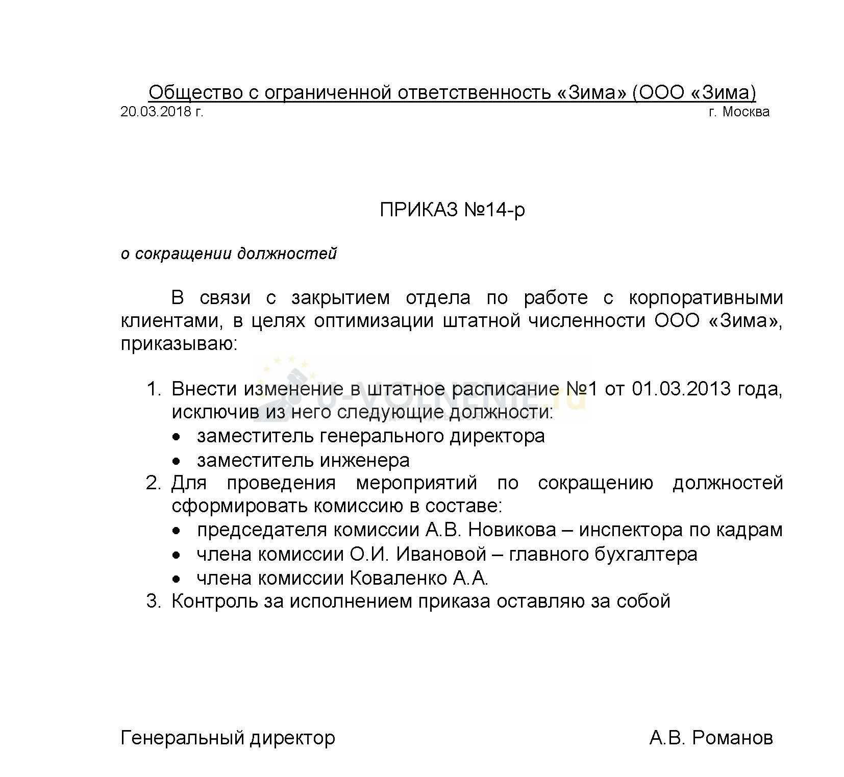 Если для сокращения нет документально подтвержденных причин, то суд вправе производить проверку всего процесса и его легитимность. Следовательно, любое сокращение начинается с принятие решения о данном действии. По этому поводу создается специальный приказ, который регламентирует создание комиссии по сокращению, устанавливающей план.