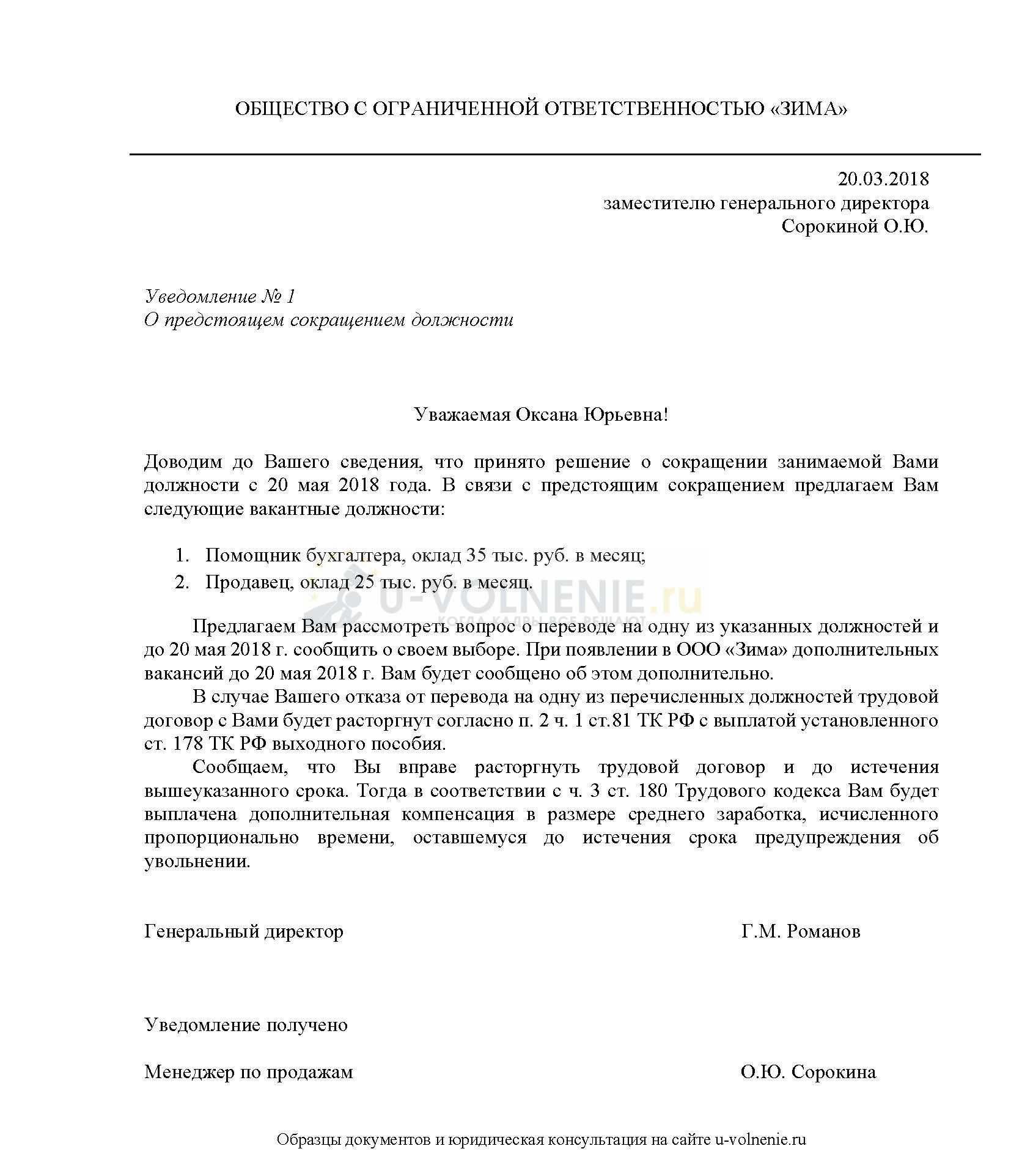 - оповещение сотрудников о предстоящем увольнении. Для этого составляется в письменном виде специальное уведомление. В нем же руководитель организации должен предложить увольняемым работникам иные должности, если таковые имеются в организации, которые будут полностью соответствовать уровню квалификации граждан. Данный документ должен быть передан работникам под подпись за 2 месяца до прекращения сотрудничества. Срок увеличивается до 3 месяцев, если осуществляется массовое увольнение (более 15 человек);