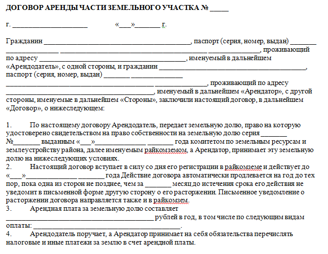 При аренде части участка заключатся такой же договор, как и при аренде всего земельного участка. С той разницей, что вместо слова «участок» в документе будет написано «часть участка».