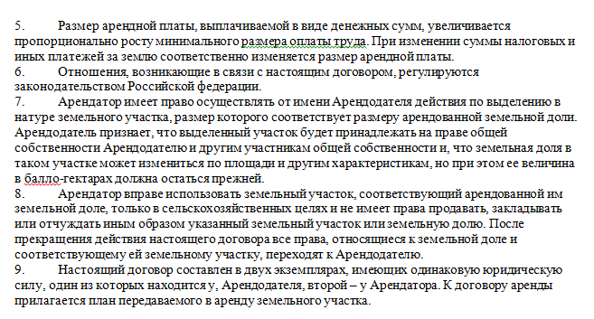 - Описание арендуемой доли участка. Здесь рекомендуется внести максимально полную информацию о территории, в том числе о наличии на участке коммуникаций, садовых деревьев, дома или иного здания.