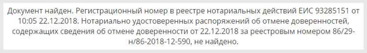 - при действительности доверенности и отсутствия ее отмены будет выдана информация о том, что документ зарегистрирован в Реестре, дата, время и номер регистрации. (дополнительно сообщено, что сведений об отмене не найдено);