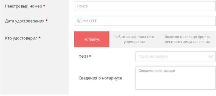 - заполнить сведения, в том числе реестровый номер доверенности, дату удостоверения, данные о нотариусе, работнике консульского учреждения или работнике органа местного самоуправления, заверивших доверенность (Ф.И.О.);