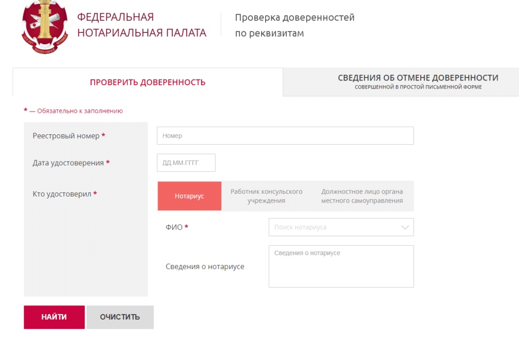 Для проверки нужно знать реестровый номер доверенности, ФИО нотариуса, который ее удостоверял, и дату ее удостоверения.