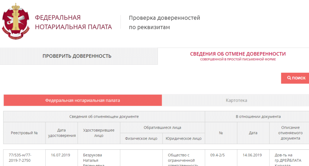 Если реквизиты соответствуют данным не полностью, необходимо уточнить условия представительства у нотариуса лично. Сведения об отмененных доверенностях вынесены в отдельную закладку на сервисе, для удобства пользователей и максимальной прозрачности сведений. Если документ не найден, значит, нотариус его не заверял.