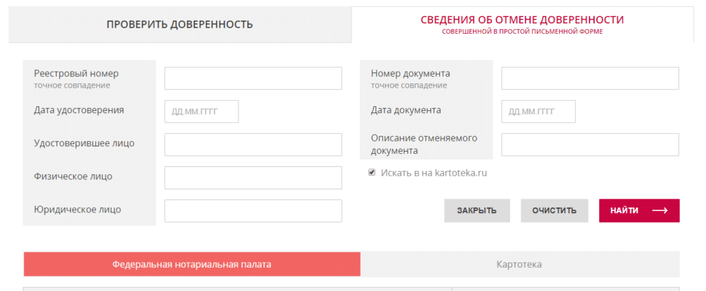 В случае если необходимо проверить информацию об отмене доверенности, следует открыть соответствующую вкладку и воспользоваться поиском по одному из доступных критериев (реестровый номер, номер документа и пр.).