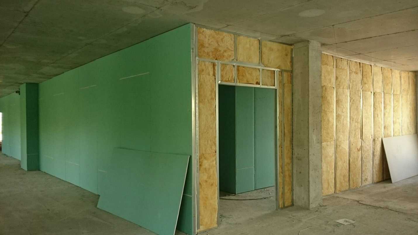 Для улучшения звукоизоляции существующих стен и перегородок их обычно обшивают гипсокартоном на пристенном каркасе, а пространство заполняют минеральной ватой большой плотности. Конструкция похожа на каркасную перегородку с той разницей, что обшивкой перегородки с одной стороны служит существующая стена.
