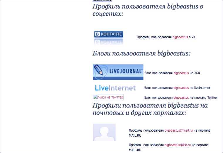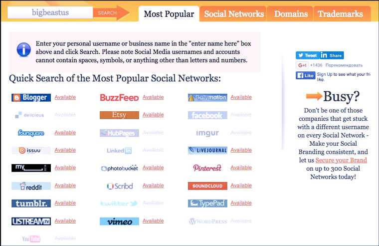 А этот сервис проверяет, заняты ли аккаунты с определенным именем на разных сайтах. В отличие от pipl.com, он ищет аккаунты еще и на Foursquare, YouTube, Delicious, Imgur и WordPress. Но, к сожалению, не дает прямые ссылки на профили.