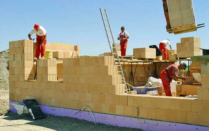 - Тип строительного материала и количество оборудования, задействованной спецтехники. Например, кирпичный дом строится значительно дольше, из-за того, что кирпич — штучный и мелкий материал, который необходимо сгружать, загружать, переносить. Пенобетонные блоки гораздо легче кирпича и более крупного размера — и погрузочно-разгрузочные работы с ними вести намного проще. То же относится ко всем другим материалам — начиная от монолитного фундамента, и заканчивая технологией возведения кровли;