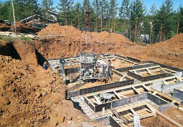 - Фундамент. Лучше всего начинать строить весной. Когда уже растаял снег и грузовые машины могут спокойно ездить по грунтовым дорогам, а экскаваторы копать землю;