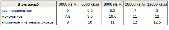 - Девятиэтажные здания (при площади от 3000 до 12000 кв.м.):