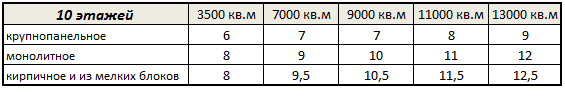 - Десятиэтажные здания (при площади от 3500 до 13000 кв.м.):