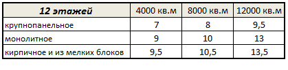 - Двенадцатиэтажные здания (при площади от 4000 до 12000 кв.м.):