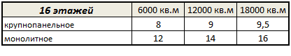 - Здания с 16 этажами (при площади от 6000 до 18000 кв.м.):
