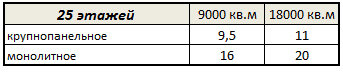 - Здания с 25 этажами (при площади от 9000 до 18000 кв.м.):