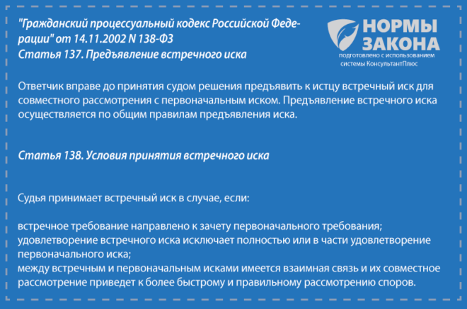 Порядок подготовки встречного заявления урегулированы правилами для обычных исков, а также специальными требованиями ГК и ГПК РФ.