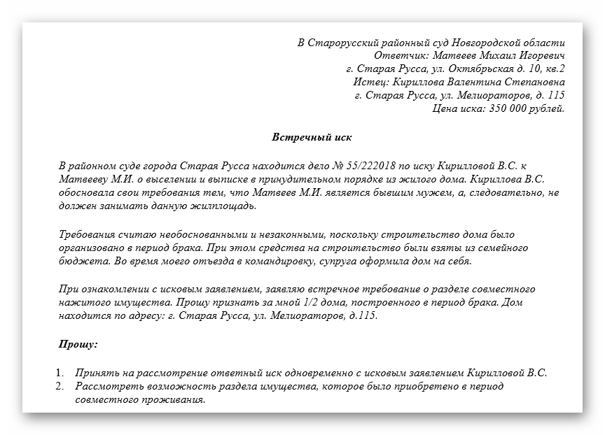 В остальном встречный иск составляется идентично образцу стандартного обращения в суд.