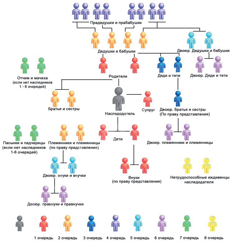 К каждой последующей очереди относятся родственники в порядке кровной приближенности. Если преемники одной из очередей отсутствуют или отказались от наследства, то имущество переходит к более дальним родственникам.