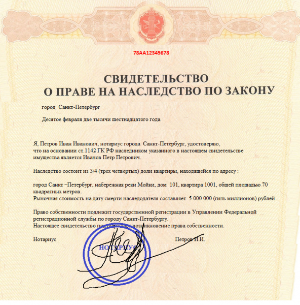 На руки заявителю выдается свидетельство о праве на наследство по закону с государственным регистрационным номером. В этом документе указывается наследственное имущество.
