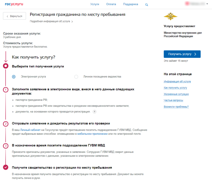 Если у пользователя ПК есть личный кабинет на портале Госуслуг, он может подать документы в по Интернету. Для этого надо зайти в личный кабинет и найти опцию «Временная регистрация» или просто воспользоваться этой ссылкой. Отсюда отправляются копии всех необходимых документов. Через 3 дня ожидания заявитель получает уведомление о необходимости явиться за получением свидетельства о прописке в назначенный час. С собой надо иметь подлинники всех документов. В свидетельстве о регистрации, которое получает гражданин, указаны его паспортные данные, место прописки и срок её действия.