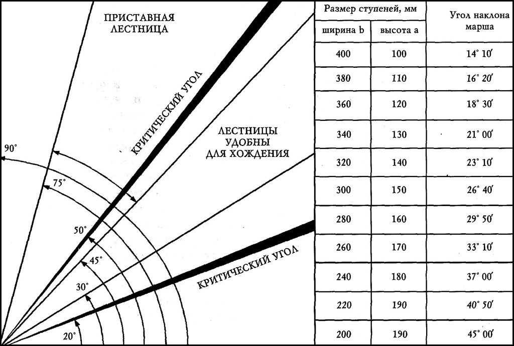 Пожарные требования к лестницам на путях эвакуации, а точнее, их размеры, были обозначены выше. Но есть и другие параметры, которые соблюдаются строго. Один из них угол наклона. Обратите внимание на фото ниже, где показаны углы наклона лестничных конструкций, удобных при перемещении по ним.