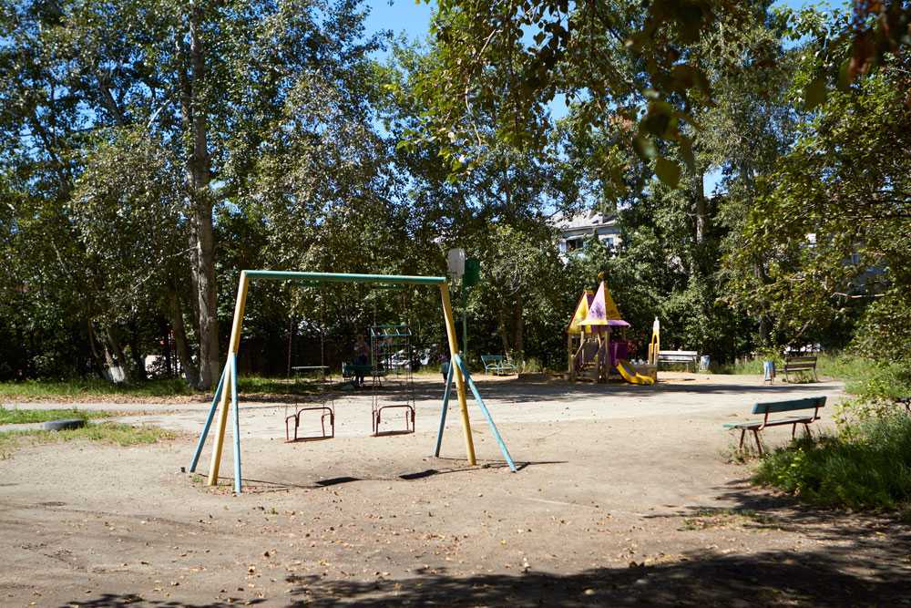 Вот двор до благоустройства. Ветхие деревья опасно склонились над дорогой, от детской площадки остались только качели, а на асфальте — ямы: