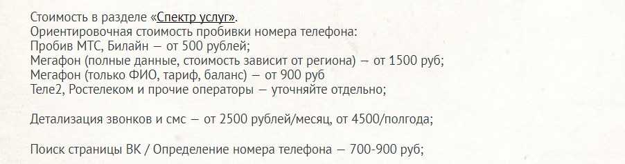 И они предоставляют такие услуги. За пару сотен долларов обещают ФИО и адрес, за тысячу и больше – полное досье: выгрузку из базы оператора, текущее местоположение, детализацию звонков. Ссылаются чаще всего на связи в органах и у оператора.