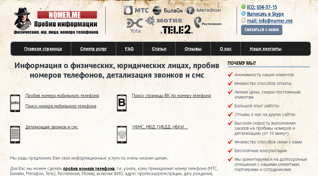 Аналогичные услуги предоставляет сайт nomer.me. Здесь обещают пробить не только номер и предоставить «ФИО, адрес прописки/регистрации, дату рождения, паспортные данные владельца, тариф, баланс, дату открытия (подключения) номера, историю владельцев номера телефона, а так же кто являлся владельцем номера телефона в заданный промежуток времени или получить полный список бывших владельцев» (орфография автора сохранена).