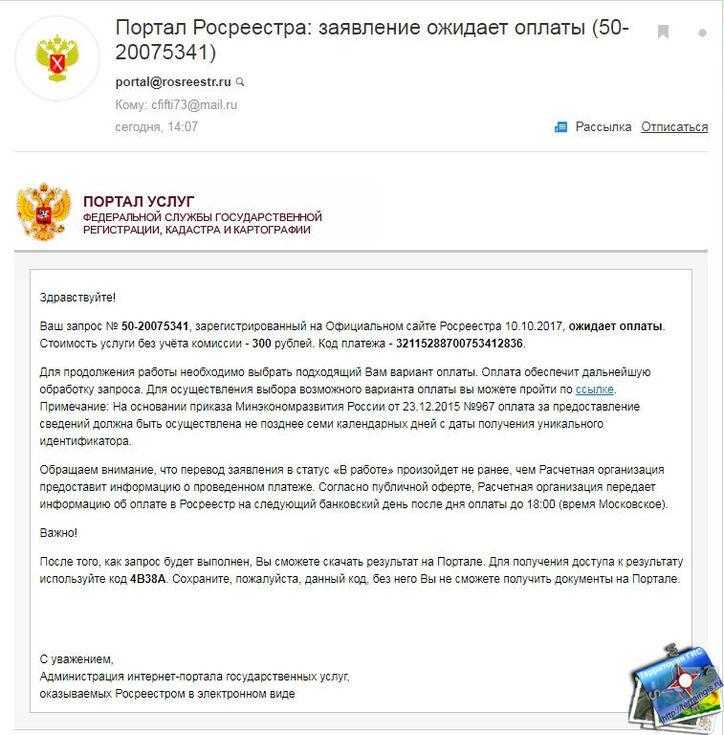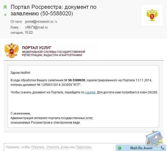 После оплаты запроса на Ваш почтовый ящик придет письмо о том, что заявка «Принята в работу». После выполнения заявки Росреестром придет третье письмо, в котором будет сообщение о том, что в ходе обработки вашей заявки получен документ. Для его скачивания переходите по прилагаемой ссылке и вводите код доступа приведенный в письме.