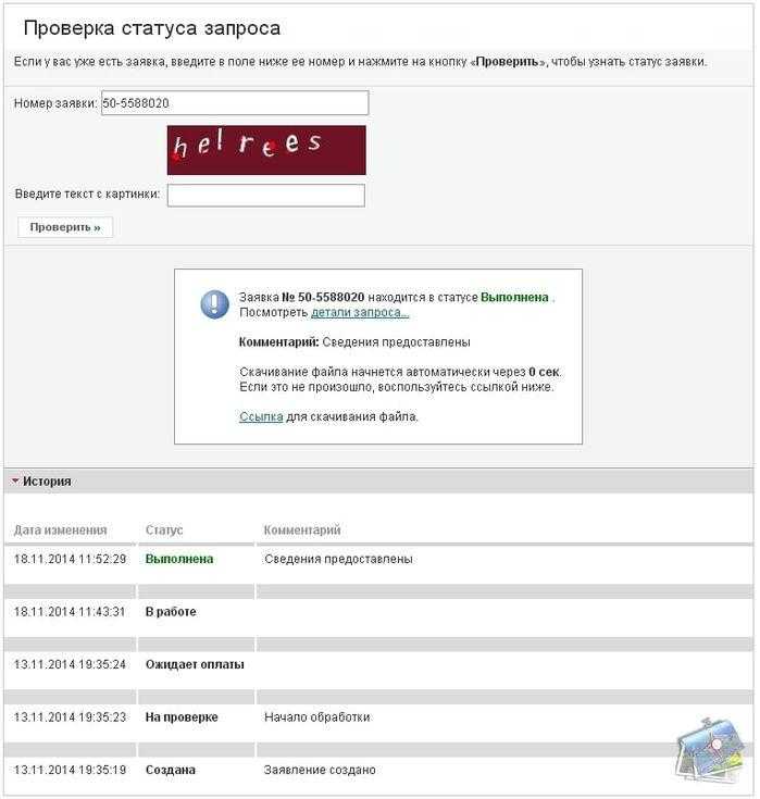 Отслеживание ситуации с Вашим запросом необходимо производит на странице «Проверка статуса запроса». Вводите номер заявки и нажимаете кнопку «Проверить». После проведения работ по Вашей заявке. Как правило на Ваш ящик придет уведомление о получение документа и возможности его скачивания по ссылке с последующим вводом ключа скачивания.