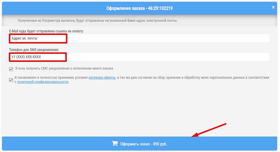 Далее нажмите кнопку «Оплатить». Затем сверяете информацию в итоговых сведениях и выбираете кнопку «Подтвердить». На телефон придет SMS-сообщение с одноразовым кодом для подтверждения оплаты, введя который Вы опять нажимаете кнопку «Подтвердить» произведя оплату выполнения Вашего запроса на получение выписки Росреестра. На следующий день до 12:00 на Ваш почтовый ящик придет сообщение о принятии вашей заявки в работу и указанием планируемой даты окончания обработки Вашей заявки.