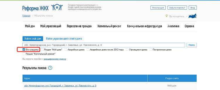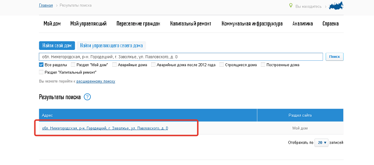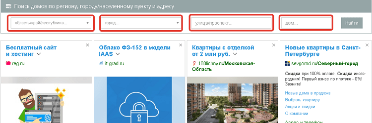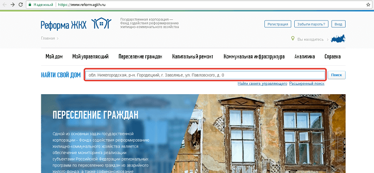 - На главной странице сайте есть строка поиска, в которую нужно ввести адрес дома.
