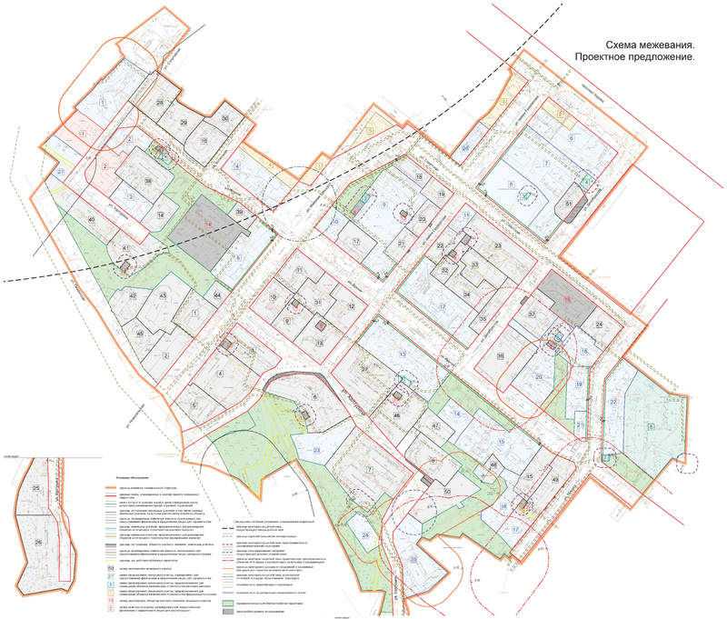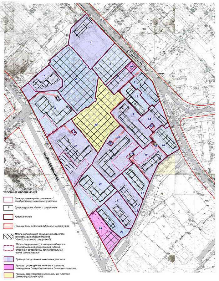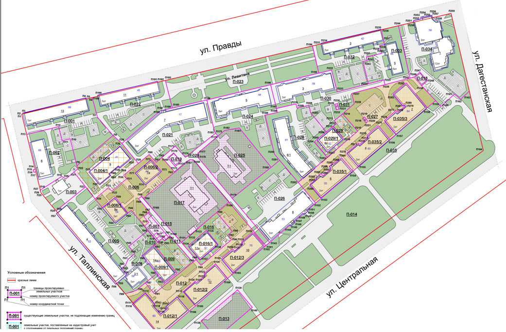 - чертежи (с применением условных обозначений, указанием красных линий, линий отступов, границ сервитутов и т.д.);