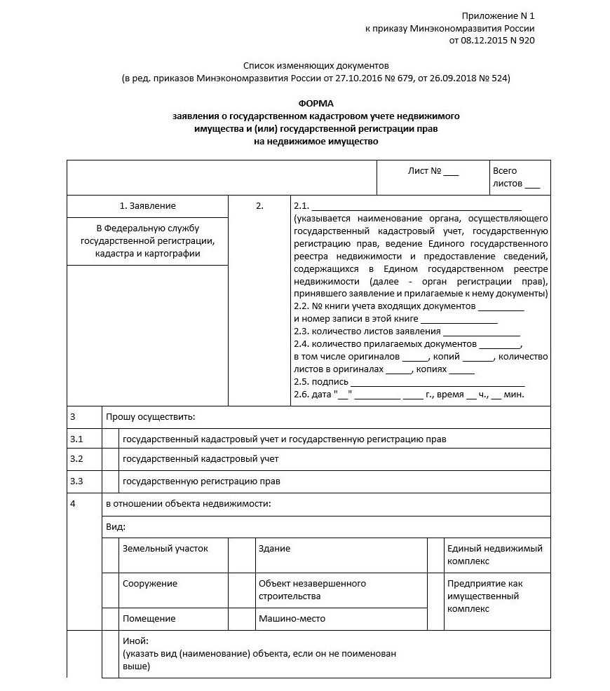 - Письменное заявление с просьбой зарегистрировать право собственности на определённый недвижимый объект (заполняется на унифицированном бланке, который можно получить на месте подачи документов или распечатать с сайта Росреестра);