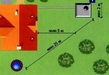 Дом должен отстоять не менее чем на 3 метра. Замеры производятся от стены дома или от выступающего цоколя. Но имеется важная оговорка. Если имеются выступающие элементы дома (крыльцо, свес крыши и т. д.) более чем на 50 см, расстояние рассчитывается от таких выступающих элементов.