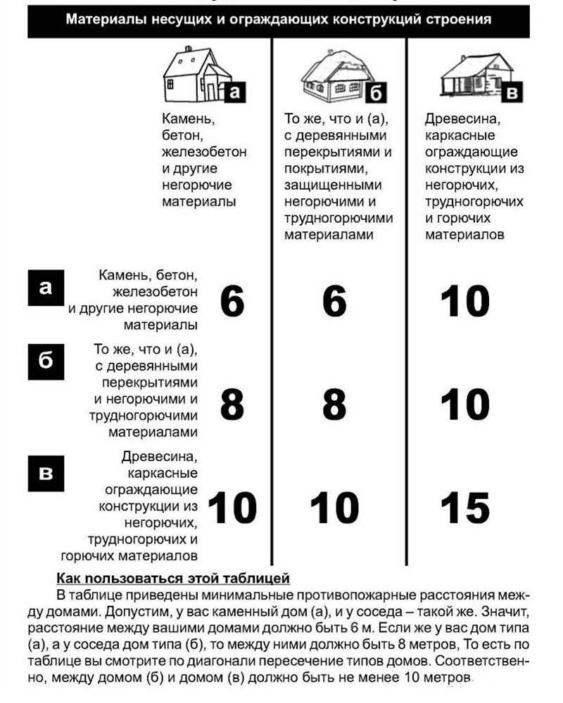ТИПМатериал несущих и ограждающих конструкций строенияРасстояния, мАБВАКамень, бетон, железобетон и другие негорючие материалы6810БТо же, с деревянными перекрытиями и покрытиями, защищенными негорючими и трудногорючими материалами8810ВДревесина, каркасные ограждающие конструкции из негорючих, трудногорючих и горючих материалов101015