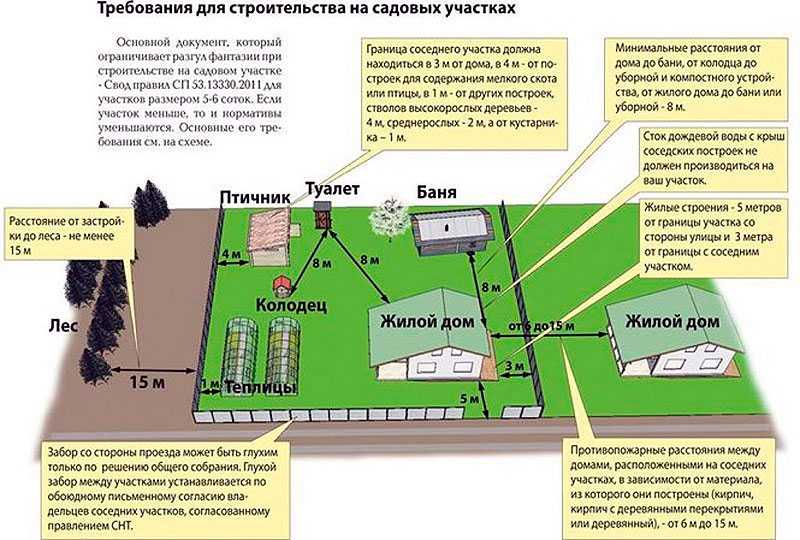 Баня должны располагаться не менее чем в 8 м от дома, а гараж не менее 1 метра от ограды и 6 м от соседнего участка.