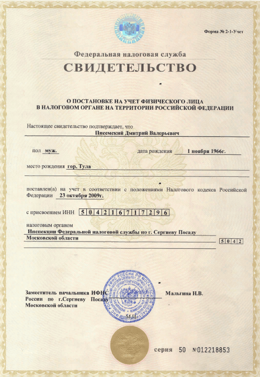 Образец свидетельства ИНН: налоговый номер присваивается гражданину или юридическому лицу только 1 раз