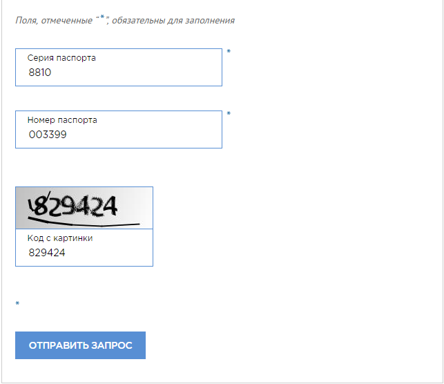Для проверки паспорта на действительность вводим серию и номер документа.