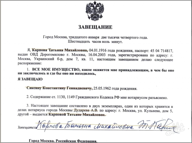 Образец завещания