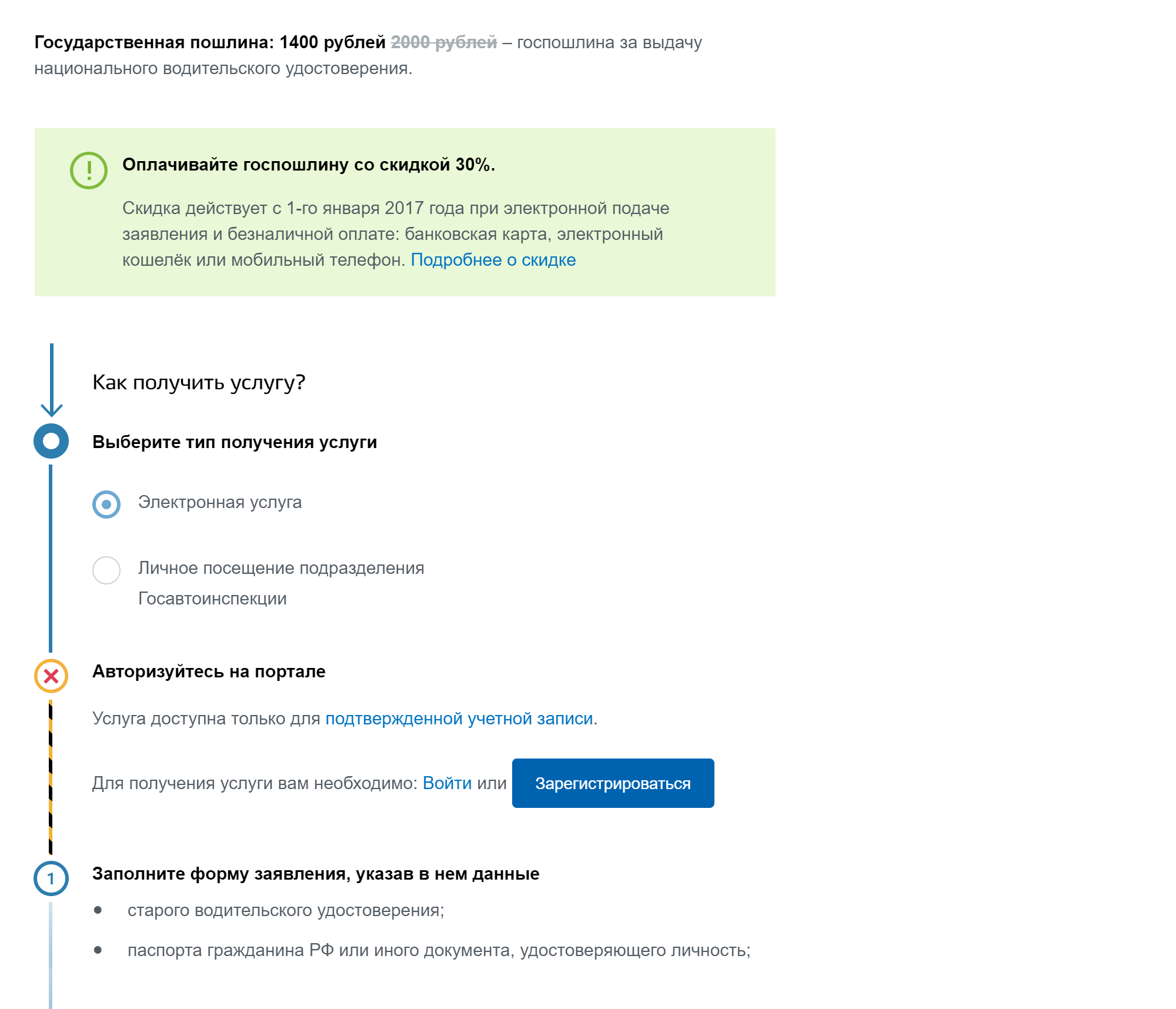 В 2020 году, если водительское удостоверение обменивается путем подачи электронного заявления на сайт Госуслуг РФ, предоставляется скидка при оплате госпошлины в размере 30% и сама госпошлина составляет не 2000 рублей, а всего 1400 рублей. Поэтому гораздо выгоднее оформлять документы через электронный сервис Госуслуг!