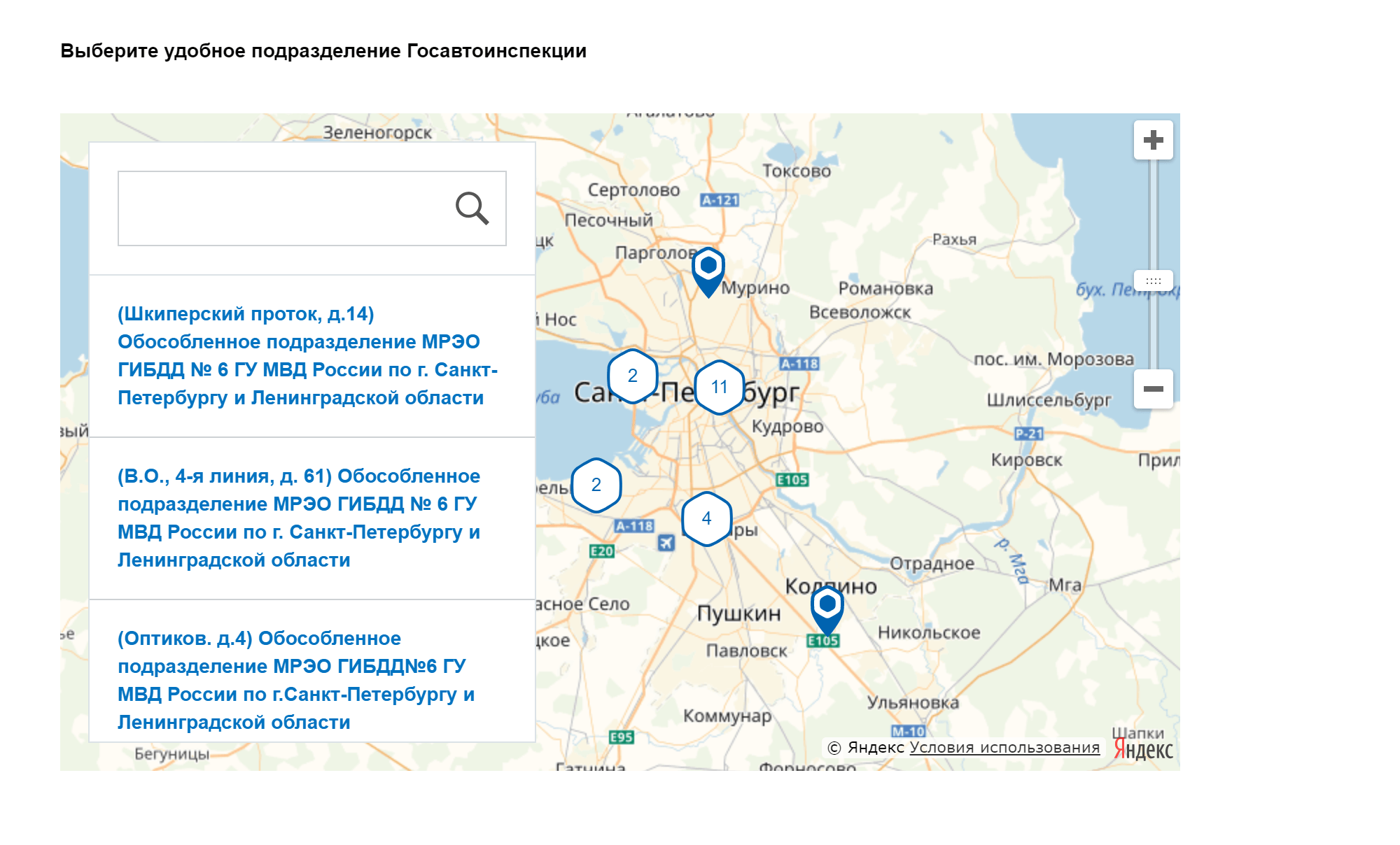 Выберите отделение ГИБДД, куда вам удобно приехать