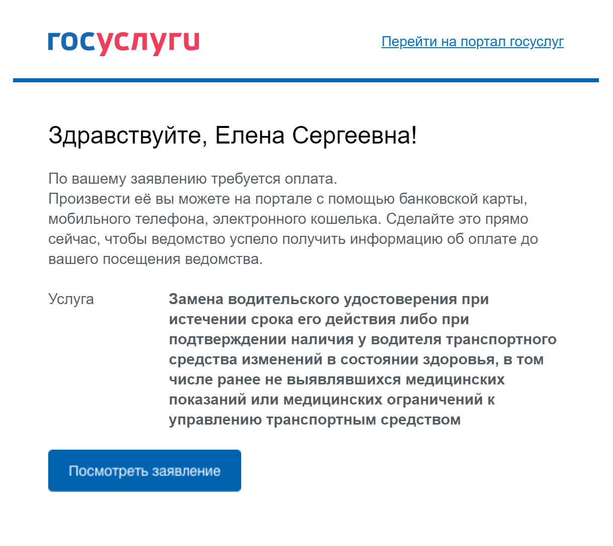 Когда вы заполнили и отправили в ГИБДД заявление, ведомство его зарегистрирует и выставит счет на оплату госпошлины — в заявлении появится кнопка «Оплатить». Ждать ее появления и обновлять страницу не обязательно — на электронную почту придет уведомление, что уже можно платить. Мне пришло через 10 минут. Если письмо об оплате не пришло в течение часа, лучше повторно отправить заявление.