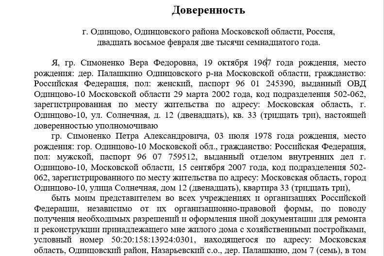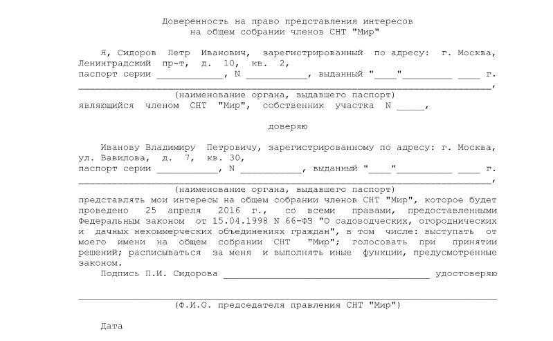 Образец доверенности на представление интересов на собрании СНТ