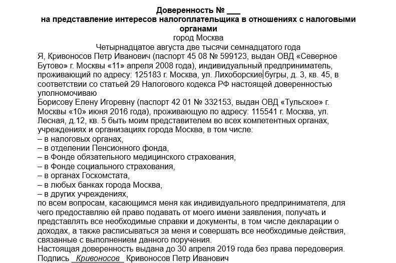 Образец доверенности в органы ИНФС