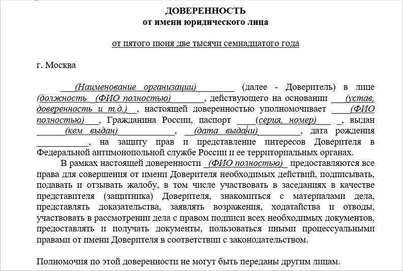 Образец доверенности на представление интересов в ФАС