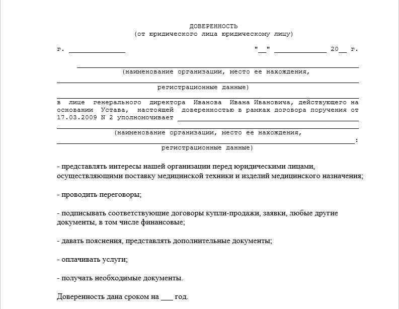 А так выглядит доверенность от юридического лица к физическому: