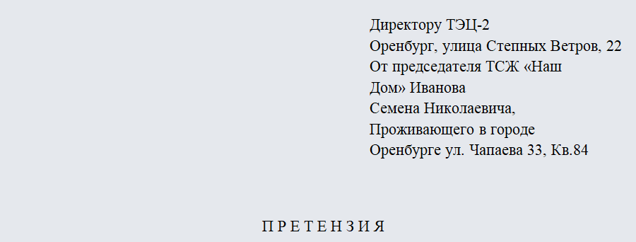 - «Шапка», или данные сторон, которые вписываются в верхний правый угол листа. Кому – наименование лица или органа, которому направляется претензия, его юридический или физический адрес. От кого – наименование (или ФИО) претенциониста, его адрес и номер телефона.