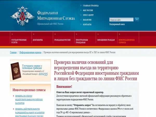 Вопрос о том, где и как проверить запрет на въезд сегодня актуален для многих иностранных граждан. Указанную информацию можно получить абсолютно бесплатно на специальном сервисе официального сайта ГУВМ МВД России (ранее ФМС России). Сведения о невъездных иностранцах, содержащихся в «черном» контрольном списке, предоставляется безвозмездно в соответствии с действующим законодательством Российской Федерации.